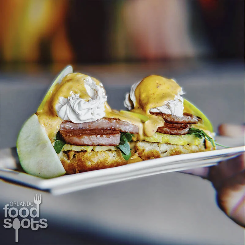 This dish offers a twist on a classic brunch dish, utilizing poached eggs upon a bed of grilled pineapple, arugula, and cured ham. The Hawaiian flare is amplified with spicy ginger Hollandaise sauce paired with sweet green apple garnish.