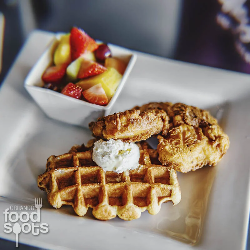This southern dish features buttermilk batter fried chicken breast alongside a fluffy Belgian waffle. The drizzle of maple bourbon syrup emphasizes the sweet-savory tastes.