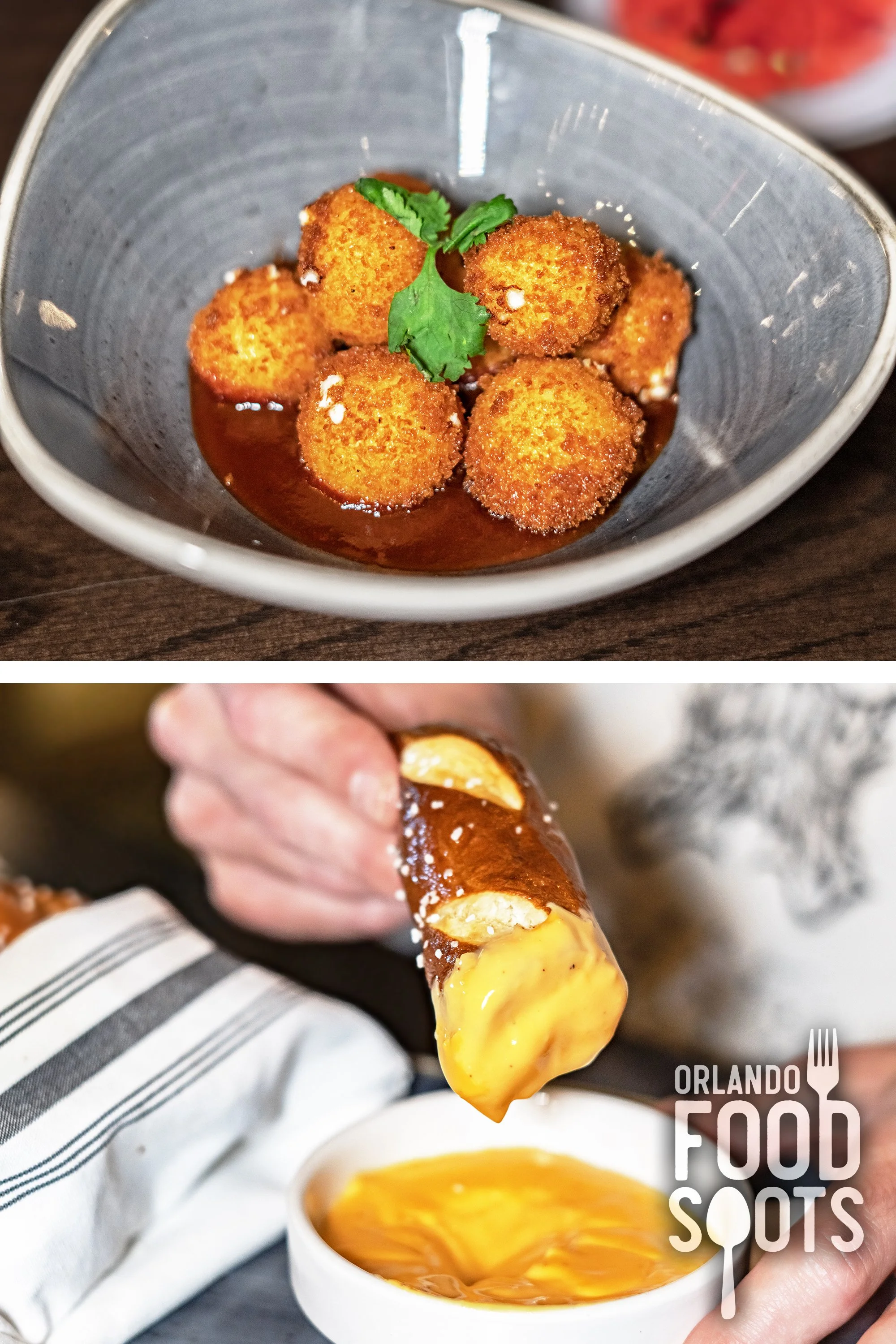 The Goat Cheese Croquettes arrive crisp and golden, giving way to a creamy, tangy interior thatβs amplified by a drizzle of red chili guava glaze for a tangy sweetness. The Soft Baked Pretzels are pillowy and warm, with an outer crust carrying a subtle malted chew. The beer cheese dip adds a rich, velvety sharpness.