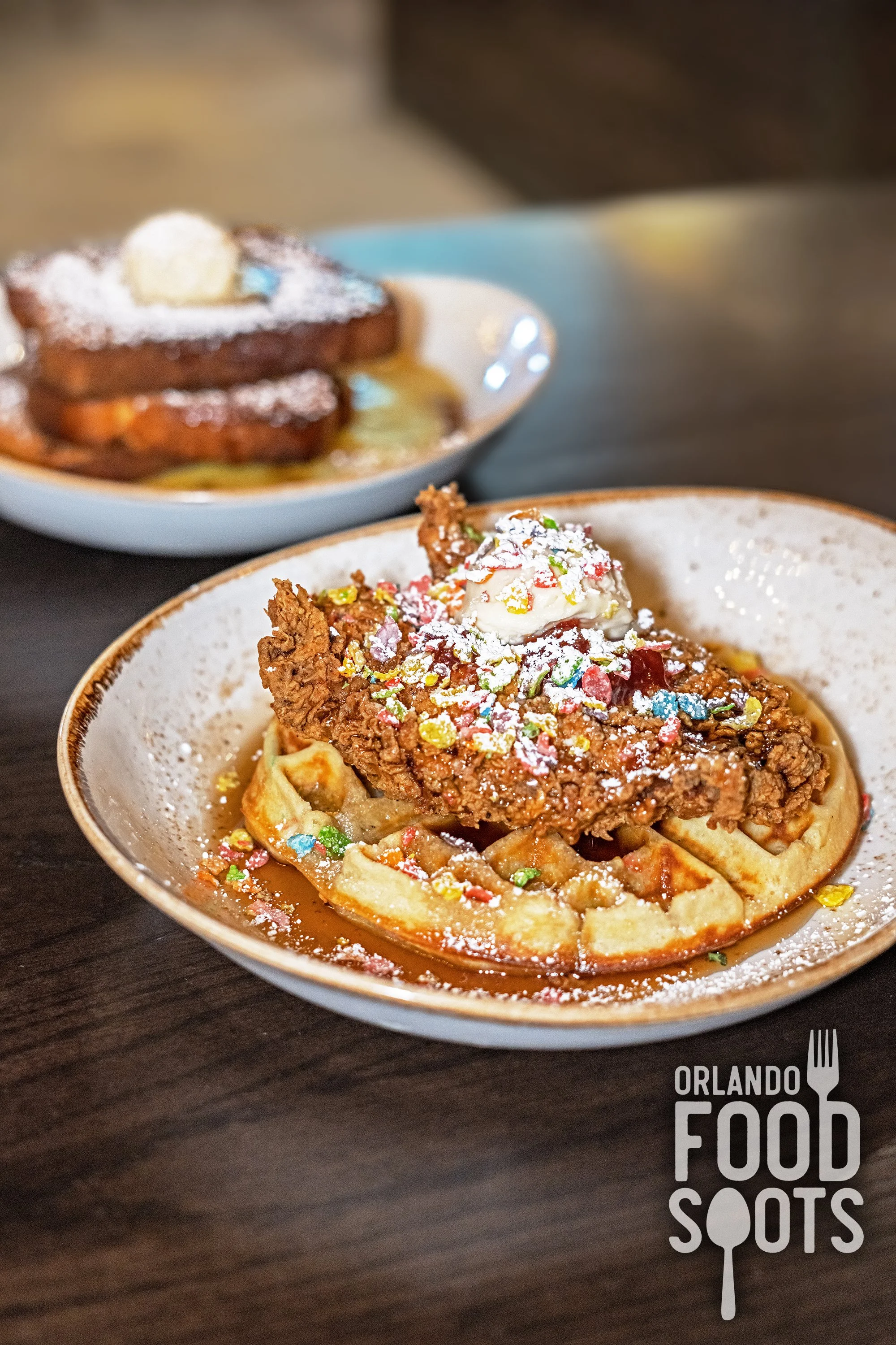The Fruity Pebbles Chicken & Waffles reimagines a Southern staple with a modern twist. Crispy fried chicken, juicy and tender within a crackling crust, sits atop golden waffles infused with a faint cereal crunch. The dishβs playful sweetness from the Fruity Pebbles glaze and the gentle heat of habanero-strawberry jam create a contrast of spice, sugar, and texture.