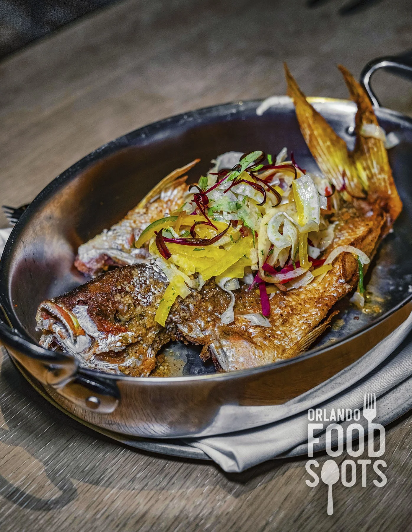This dish provides a level of drama with a whole, roasted Florida market fish that holds a tender meat texture with seasoned skin offering moments of crisp. The seafood flavor is brightened with grapefruit mojo and charred lemon, while shaved fennel provides a slight depth of aroma.