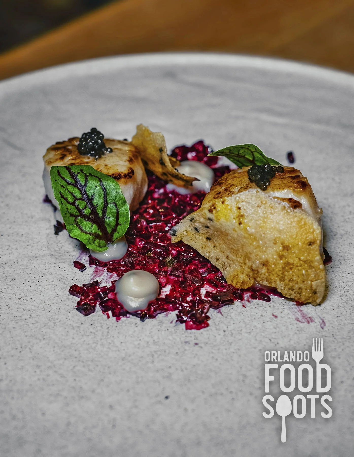 This dish offers scallops a la plancha for a smokey seafood flavor, topped with caviar to amplify the salty oceanic taste. The beetroot tartare adds vibrance to the aesthetics, holding a creamy texture to balance the flavors, while the yuca crisp provides a slight crunch.