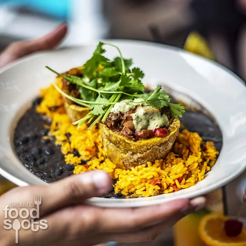 This dish features braised beef encased in Tostones cups, atop a bed of yellow rice and black beans. The meat is tender and amplified with the flavor of the Cilantro Crema sauce, delivering that authentic island taste.