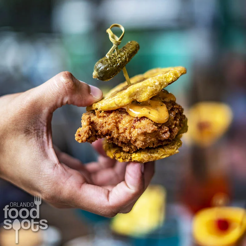 This dish showcases classic sliders with a Caribbean twist. It's prepared with Tostones with buttermilk fried chicken inside. The Sriracha aioli adds a different flare to the sliders; similar to Mayo-Ketchup with a kick.