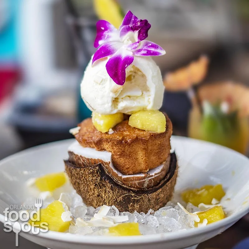 This aesthetic dessert will satisfy any coconut lover. This dish features coconut-pineapple ice cream atop warm coconut cake to serve us that warm-cold, decadent taste. It’s topped with fresh pineapple and toasted coconut, all inside a coconut!