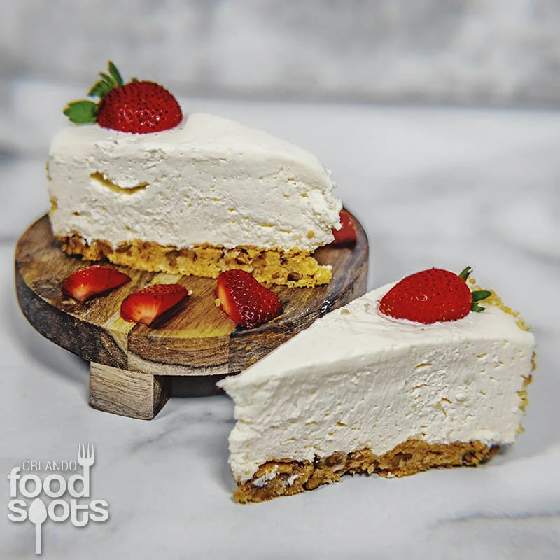 This dessert holds an indulgent cream with a tart taste that isn’t overwhelmingly sweet. The fruit bits add a hint of natural sweetness, while the pecan crust adds a satisfying crunch to each forkful.