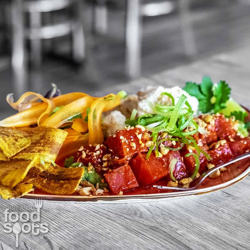 This dish is best partnered with a Pacifico beer, as it features raw tuna cubes coated in lime, alongside marinated vegetables, fresh avocado, and chopped peanuts. The side of Chicharrones provides a satisfying crunch to the dish.