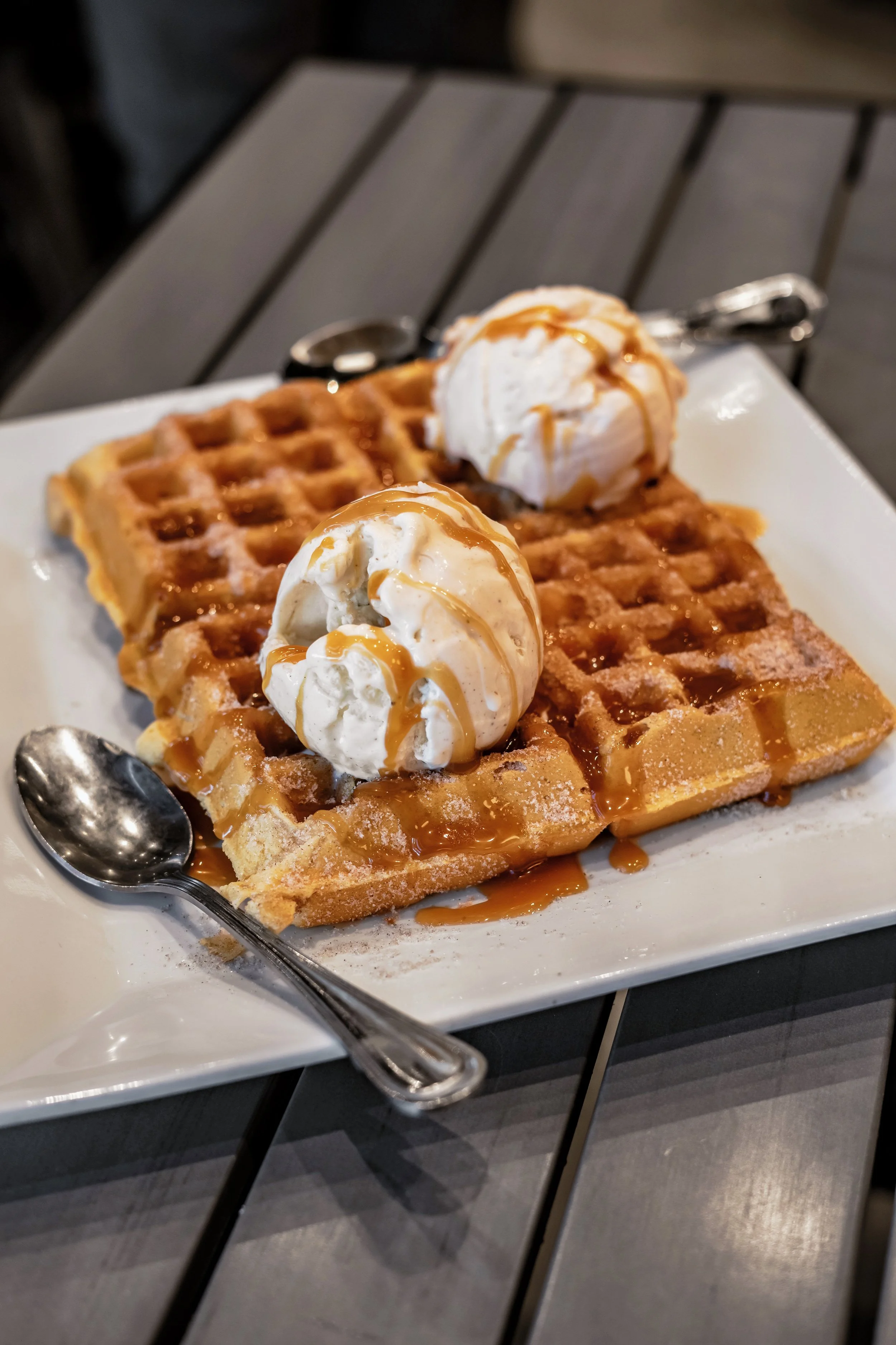 Crisp on the outside and fluffy on the inside, this vanilla waffle is coated in a sweet cinnamon-sugar blend reminiscent of classic churros. Two scoops of creamy vanilla ice cream melt into the warm waffle, while a drizzle of rich caramel brings it all together.