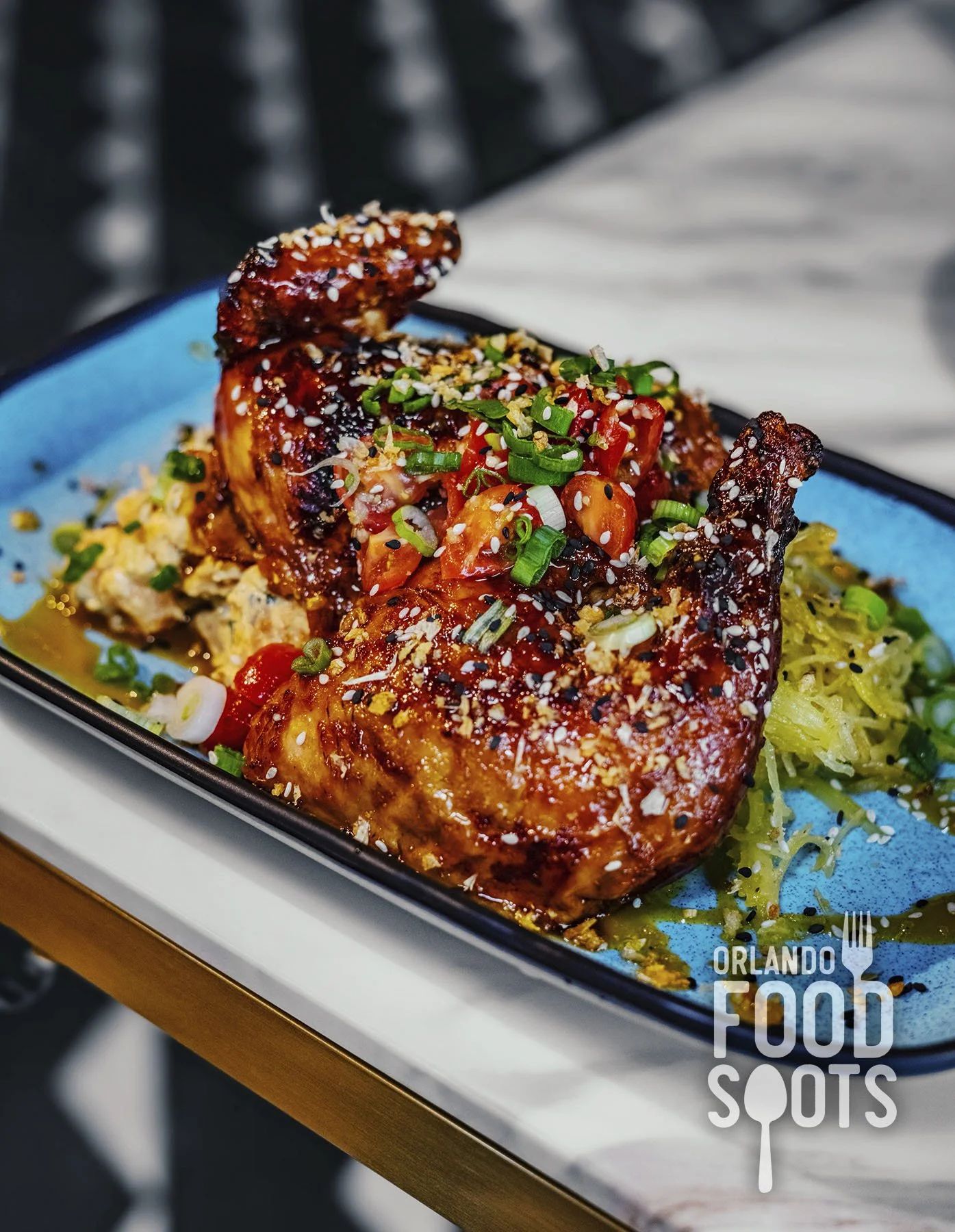 The Huli-Huli BBQ chicken is fully cooked through, though still maintains a buttery moisture. The skin holds a sweet-savory tang, topped with pineapple-sweet pepper puree and crispy garlic. The sesame seeds provide additional texture alongside a Hawaiian flair.