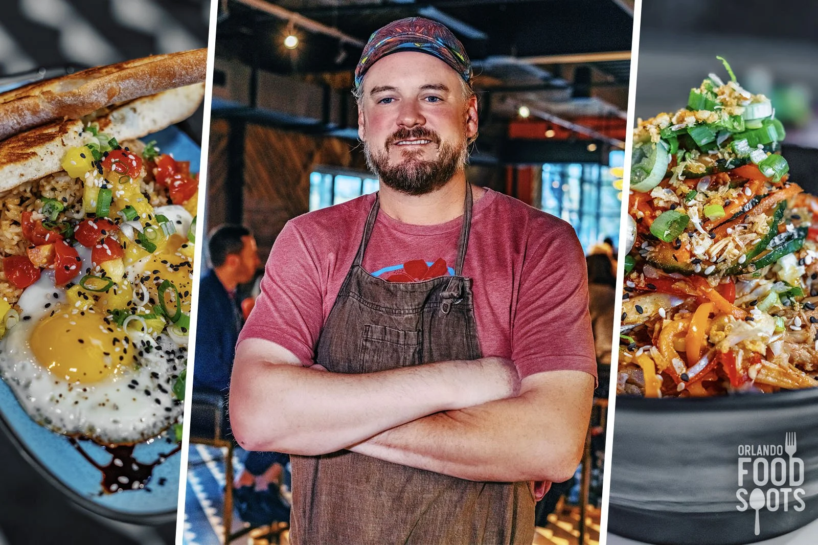 This dish offers protein via over-easy eggs that deliver satisfying #YolkPorn, brightened by the tang of ginger jus. Artisan bread from Olde Hearth Bread Company holds a slight crisp, upon a bed of Spam fried rice for a salty bite, amplified by the sweetness of pineapple salsa. The scallion and sesame seed garnish provides a fresh crunch and aesthetic color.