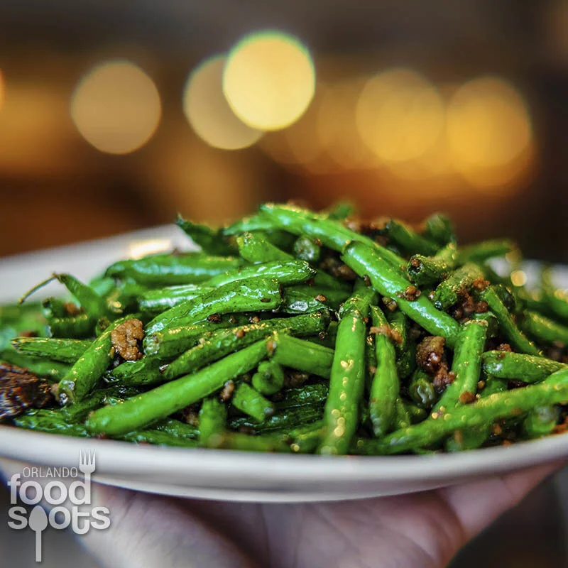 This plate is a heaping serving of string beans, intended for sharing among the entire table. The green beans are stir fried, presumably with soy sauce for a slightly salty taste. The minced pork adds a savory element to the vegetable plate.