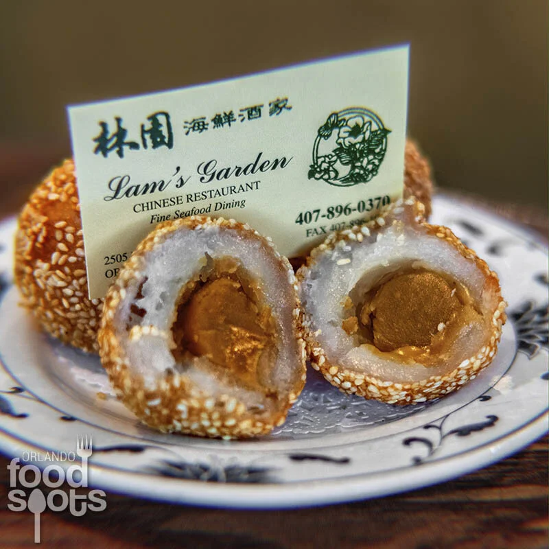These sesame balls are a warm treat that complete a happy ending to a dim sum meal. The red bean filling is slightly sweet, with a sticky paste texture that matches the sticky rice coating. The thin, deep fried outer layer helps wrap everything together.