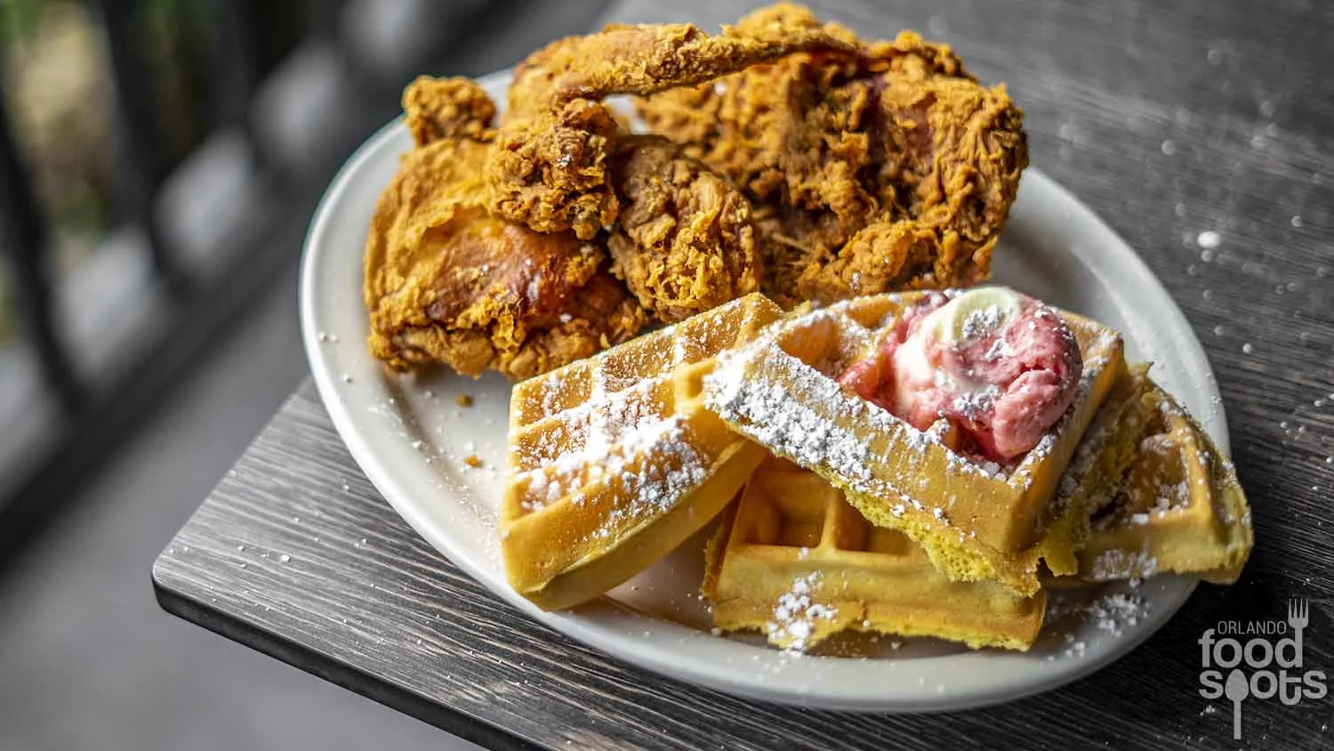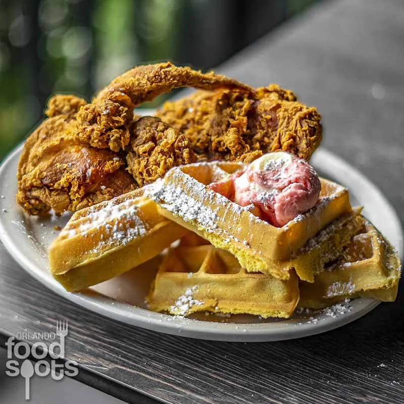 I would hail this as their signature dish. The portion is satisfying, offering a full bird of chicken. They brine the chicken and marinade it in a mixture of Dijon mustard and poultry seasoning for 24 hours. The crisp of this fried chicken captures true Southern flavor! It’s accompanied by a fluffy waffle topped with strawberry butter and powdered sugar, offering that sweet-savory experience.