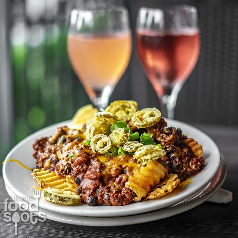 This dish features a bed of potato chips topped with homemade chili, melted cheddar, chipotle ranch and green onions. The chips are nicely crisp French fries that deliver a subtle, yet satisfying crunch. The fried jalapeños provide a slight kick.