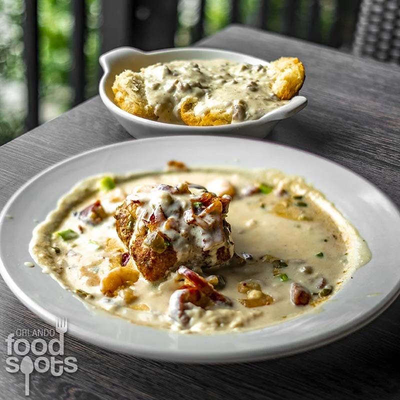 This plate features 2 fried grit cakes infused with cheese, roasted red peppers and Andouille sausage. It’s topped with shrimp, sausage, onions and peppers, while being garnished with chopped bacon and green onions. The shrimp sauce itself is filling, and adds a heavy texture to the grits. Large biscuits drizzled in hearty, scratch-made sausage gravy is a classic Southern side to accompany this dish.