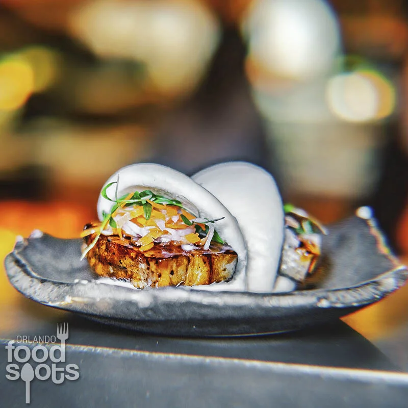 These Bao buns encase pork belly and coconut milk slaw for hint of sweetness. The pickles and house made sriracha add some tangy depth to the bites.