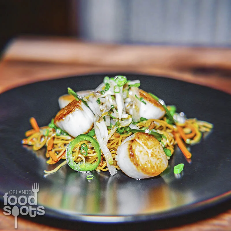 These savory noodles feature a mild sauce made with spicy fresno chili peppers. The dish is a medley of locally-sourced scallops, bean sprout salad, and pickled jalepeรฑos for a spicy depth.