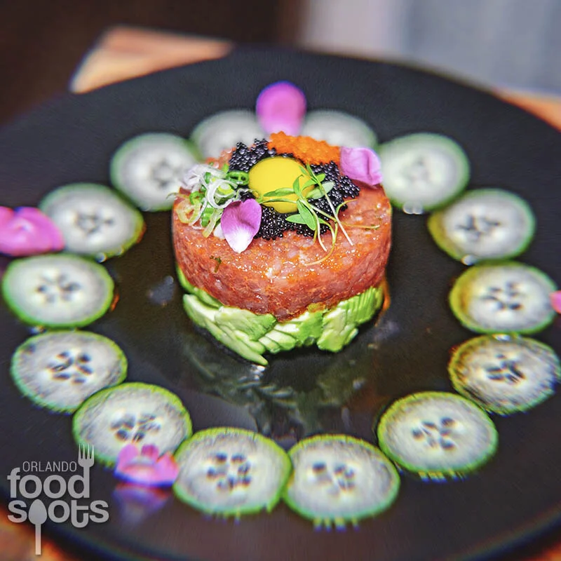 This dish is both elegant and filling, featuring an avocado base, stacked with tuna tartare, and topped with scallions and microgreens.The black tobiko and orange masago add a salty flare, alongside a bouncy crunch. Quail egg and ponzu dressing add additional texture.
