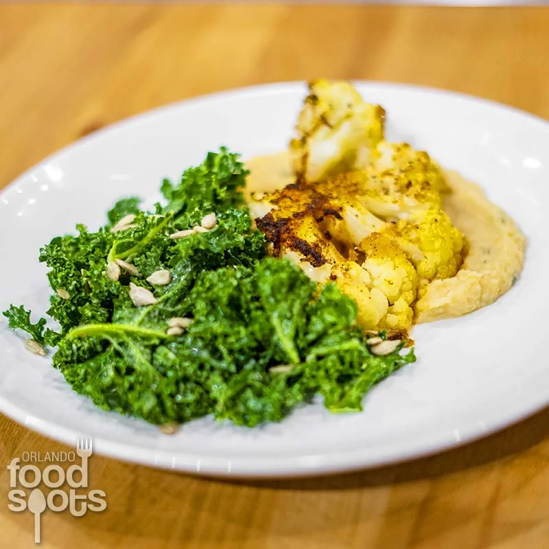 Slicing entire heads of cauliflower is how these steaks are made. A variety of seasoning added flavor to the steak, while we also made kale dressed in vinaigrette and sunflower seeds as the side.