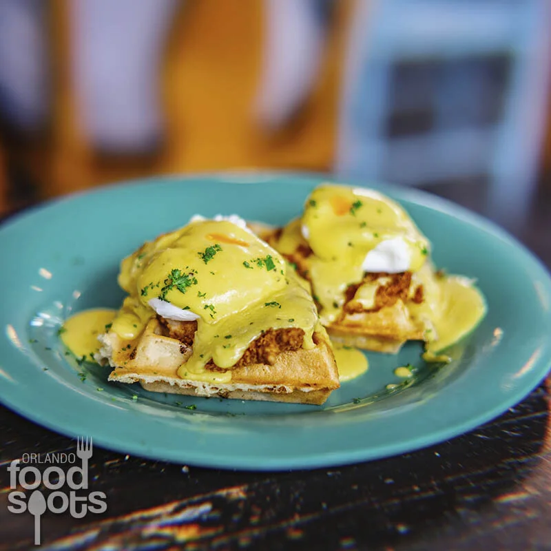 This dish is composed of southern fried chicken on waffle pillows, topped with egg and Hollandaise for a breakfast twist. The maple bourbon syrup adds a sweet richness to each bite.