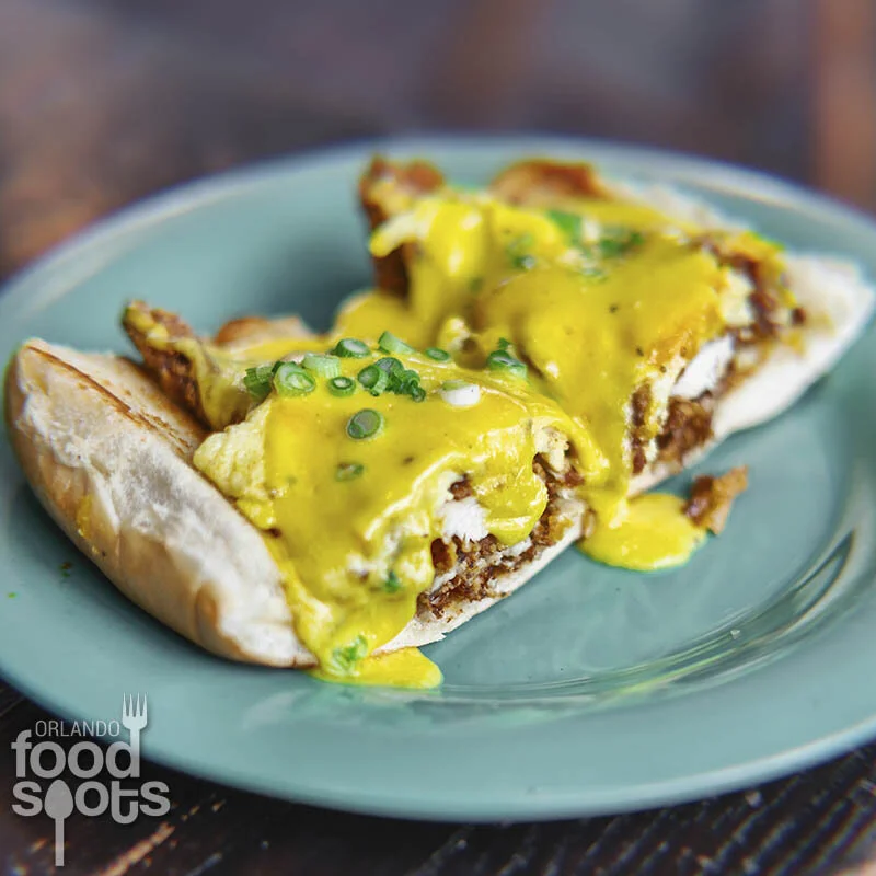 This quick, go-to breakfast sandwich features southern fried chicken with a pour of Hollandaise. It’s topped with scallion, bacon, egg, and cheddar cheese for additional texture and taste, all atop a hoagie bun.