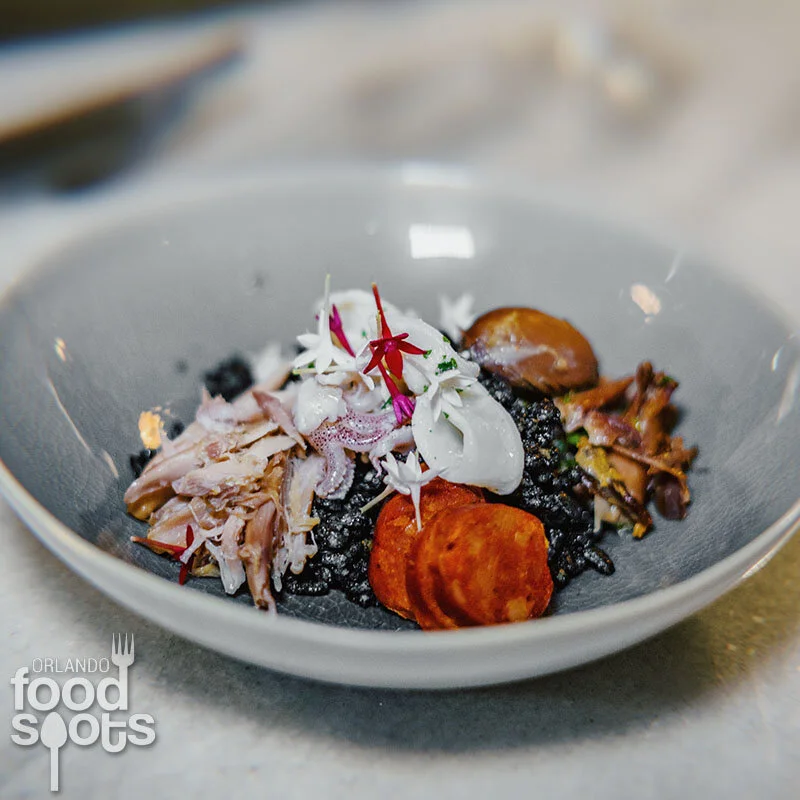 This course offered a refreshing twist to a classic paella by including rabbit confit, which added a gamey flare to the dish. The meaty tang was continued with duck meat, atop a bed of rice that offered the seafood element to the bowl. The rice is prepared with lobster stock and squid ink for a robust ocean flavor. The handmade chorizo added an additional layer of saltiness.