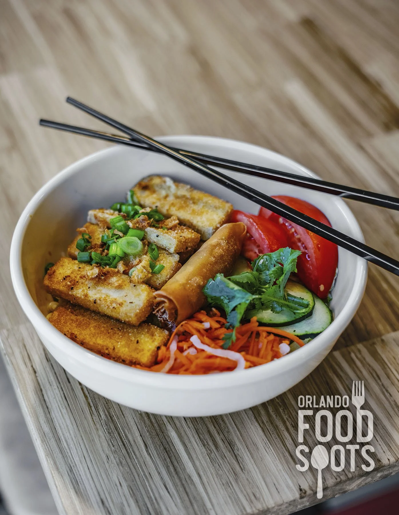 This plant-based bowl offers crispy tofu and a vegetable spring roll atop a bed of noodle and salad for a variety of textures. The tomato and cucumber add a cooler freshness, while the carrots provide a traditional Viet flair. The vegan sauce provides the bowl with a savory flavor.