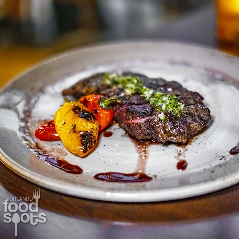 A 10oz. flat iron steak is the focal point of this dish, cooked Medium-Rare from a wood burning grill. The smokey flavor and juiciness of the meat was complimented by the Chimichurri sauce